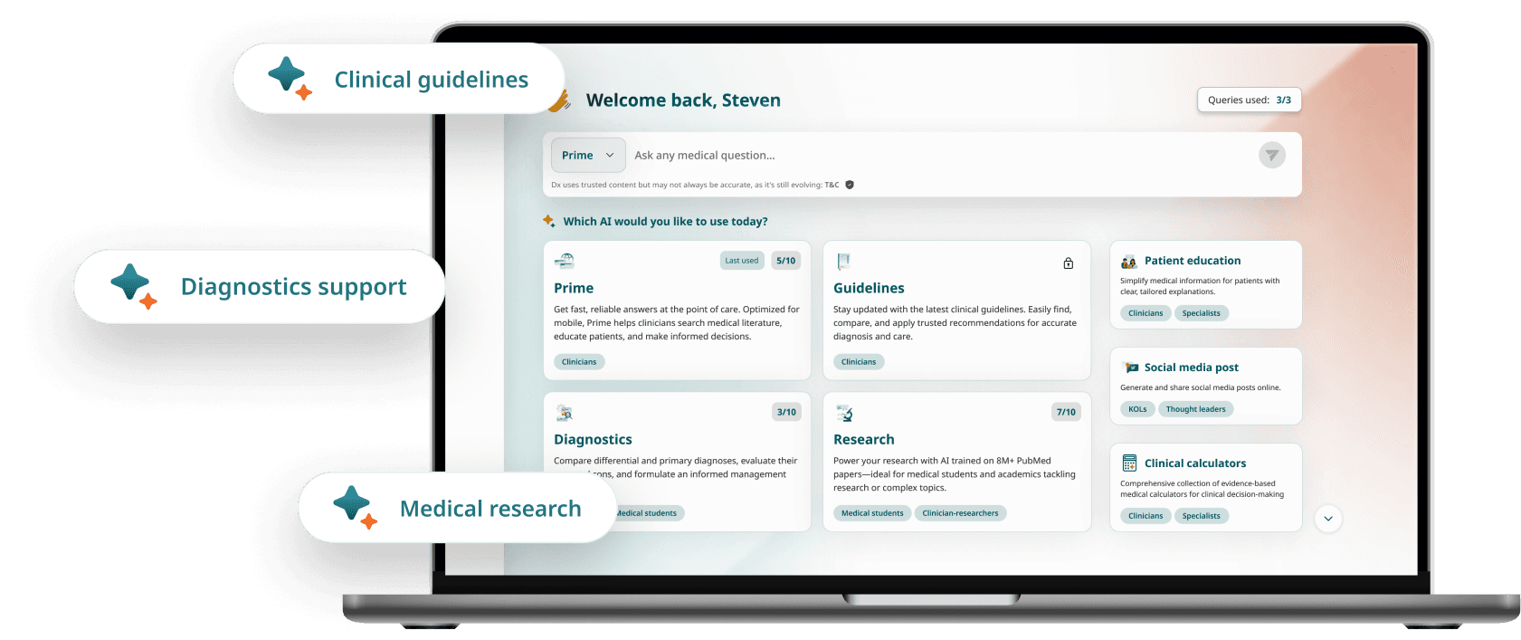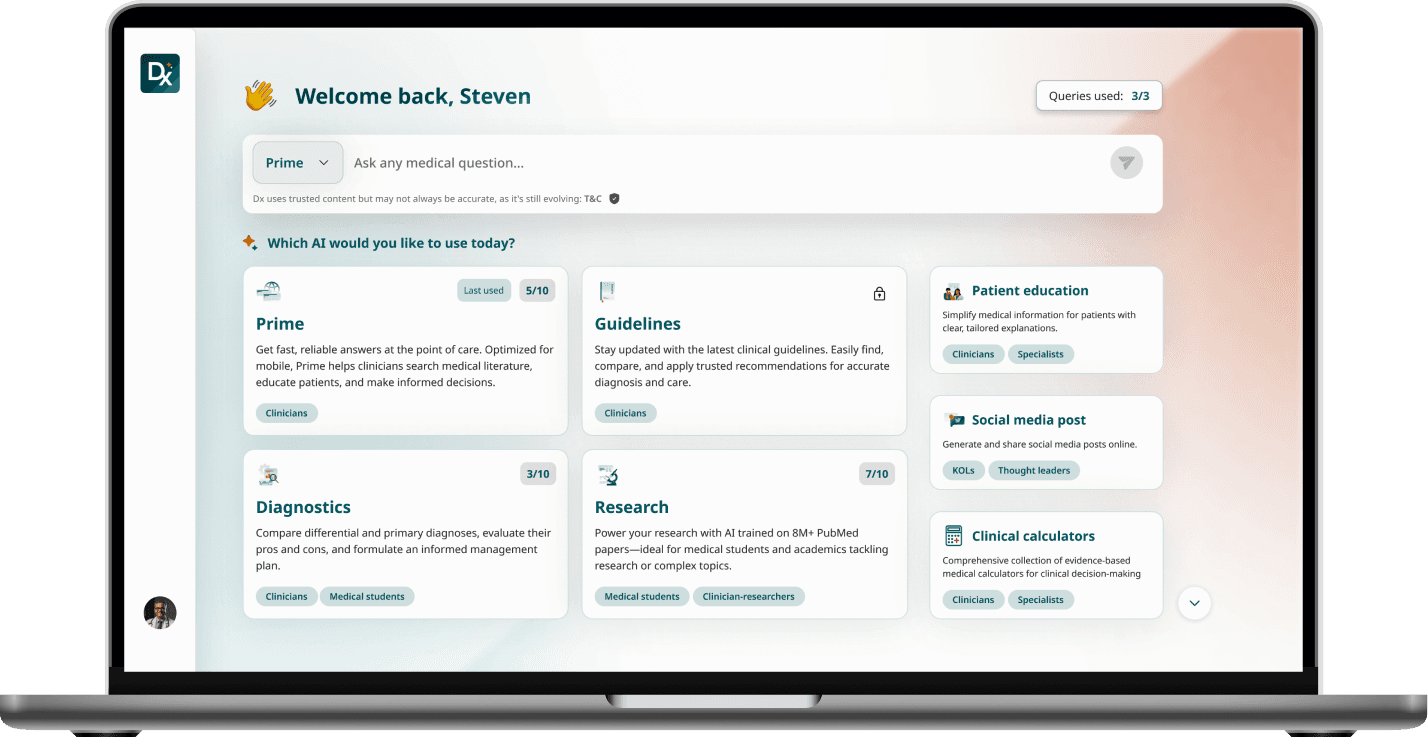 Doctors make hundreds of decisions a day — under time pressure, with incomplete information, and little room for error. Dx is Docquity's answer to that challenge. An AI-powered clinical assistant housing 7 specialised agents, Dx supports clinicians across the full spectrum of their daily work, from staying current with medical literature to making faster, more confident clinical decisions. Learn more